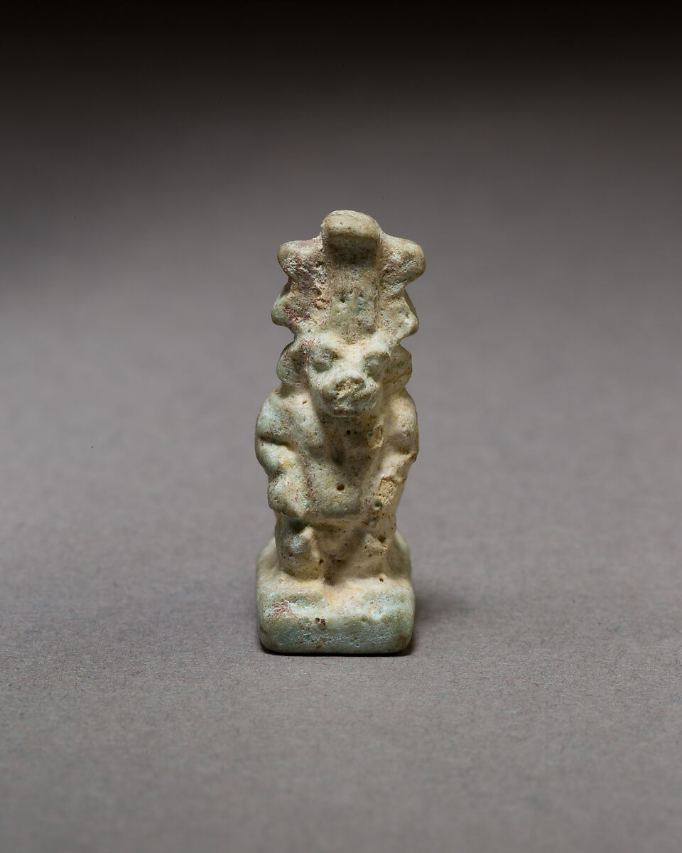 Hybrid deities combine a given deity's form with often animal elements from other deities. Here the dwarf-like body of Pataikos is combined with what appears to be a baboon's head, judging from the tufts of hair on the cheeks. The back is a falcon back. The headdress has a foliate and curving appearance not typical of Egyptian crowns and is difficult to understand.