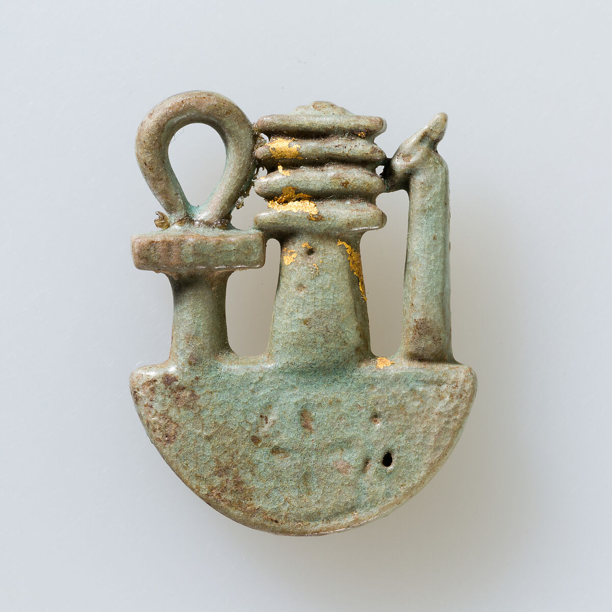 Other elaborately carved faience examples may be uninscribed, and this one, though quite simple, was covered in gold. The date of these is uncertain, but they may belong to a continued function of the symbol as a New Year's offering, perhaps presented to a god in a temple. The festival association is strengthened by the fact that the bowl beneath the tall signs is not the standard neb basket but the heb bowl, which is the hieroglyph for festival.