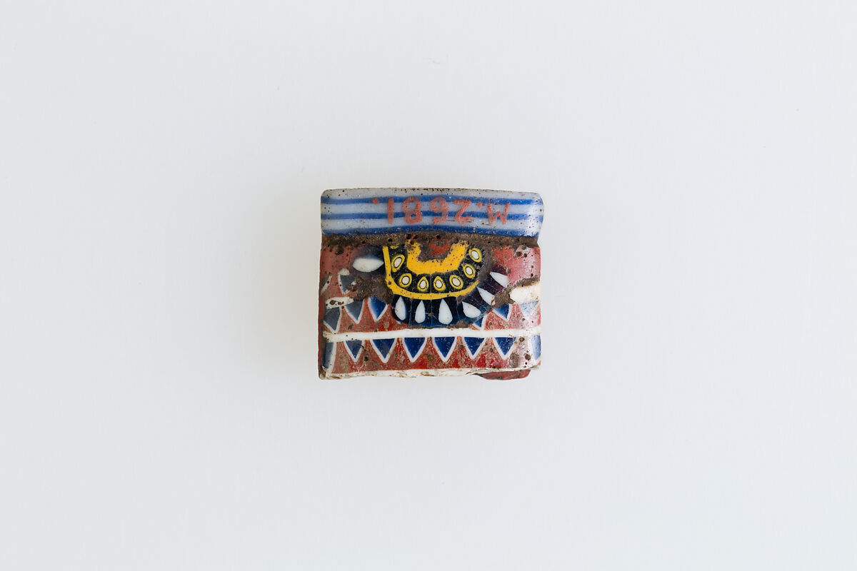A mosaic glass technique allowed multiples of an image to be created: a figural or design composition was made by bundling colored glass canes, which were then drawn out into a long bar. The bar was then sectioned at right angles, probably by striking the bar with appropriate tools, to produce small inlay tiles. The tile would then be smoothed and polished on the face intended to appear outwards.
