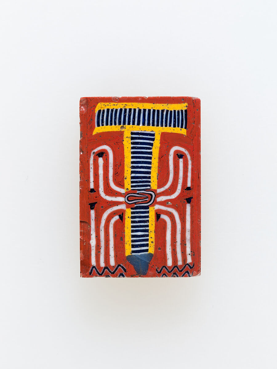 A mosaic glass technique allowed multiples of an image to be created: a figural or design composition was made by bundling colored glass canes, which were then drawn out into a long bar. The bar was then sectioned at right angles, probably by striking the bar with appropriate tools, to produce small inlay tiles. The tile would then be smoothed and polished on the face intended to appear outwards.