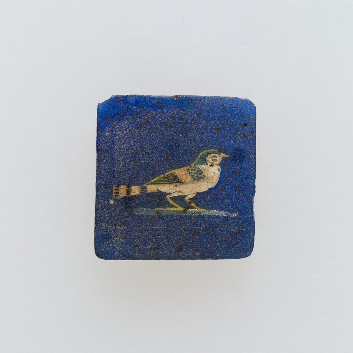 A mosaic glass technique allowed multiples of an image to be created: a figural or design composition was made by bundling colored glass canes, which were then drawn out into a long bar. The bar was then sectioned at right angles, probably by striking the bar with appropriate tools, to produce small inlay tiles. The tile would then be smoothed and polished on the face intended to appear outwards.