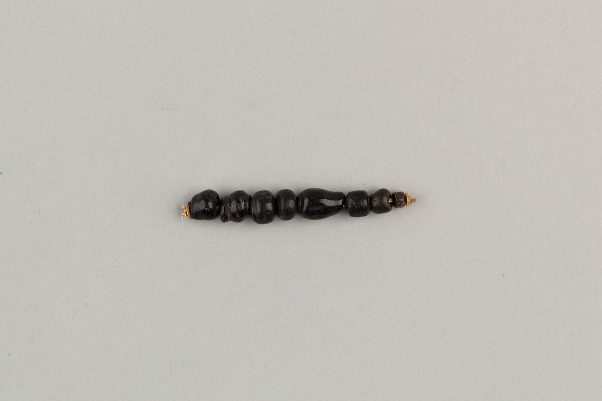 These round glass beads are colored to imitate semi-precious stone. Here the black glass may represent hematite.