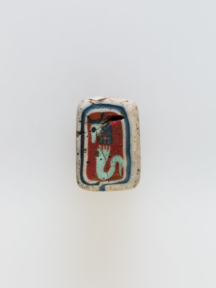 A mosaic glass technique allowed multiples of an image to be created: a figural or design composition was made by bundling colored glass canes, which were then drawn out into a long bar like this partially preserved example. The bar was then sectioned at right angles, probably by striking the bar with appropriate tools, to produce small inlay tiles. The tile would then be smoothed and polished on the face intended to appear outwards. The cow-headed serpent here may represent Isis-Hathor, although there is no crown to support the identification.