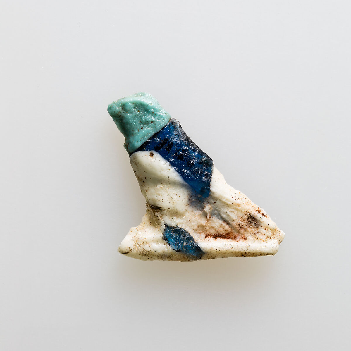 Starting in the later Late Period and continuing through the Ptolemaic Period, a type of glass amulet cast by pressing the glass into a shallow open mold appears. The back was left rough, and the amulets may look ragged because glass overflowed the mold around the edges. The earlier amulets are monochrome, bi- or multicolor amulets supplement the repertoire during the Ptolemaic Period.