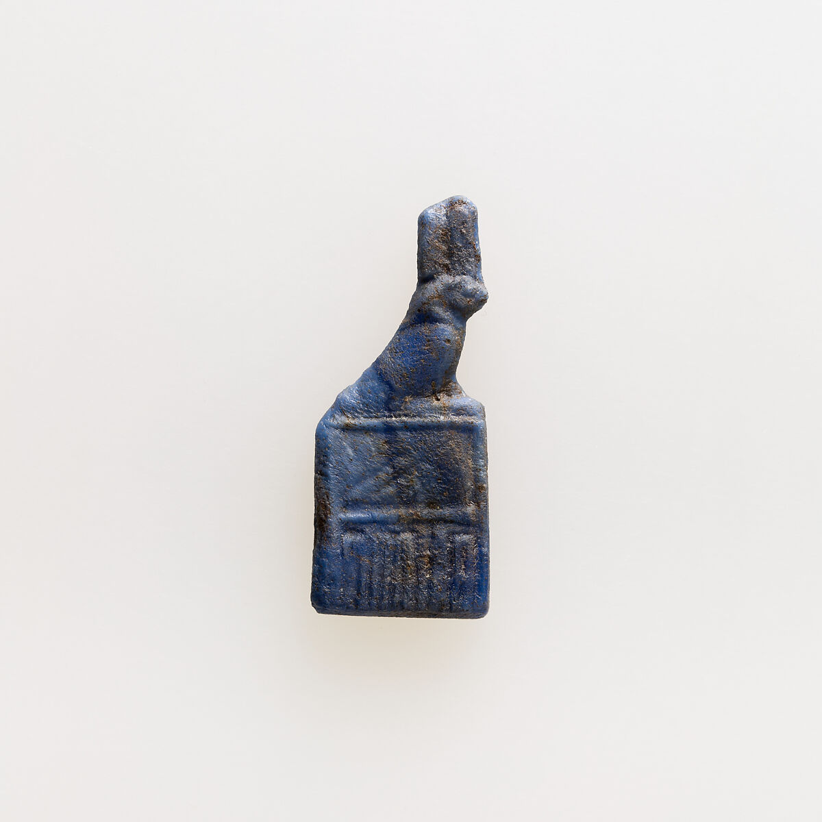 Starting in the later Late Period and continuing through the Ptolemaic Period, a type of glass amulet cast by pressing the glass into a shallow open mold appears. The back was left rough, and the amulets may look ragged because glass overflowed the mold around the edges. The earlier amulets are monochrome, bi- or multicolor amulets supplement the repertoire during the Ptolemaic Period.