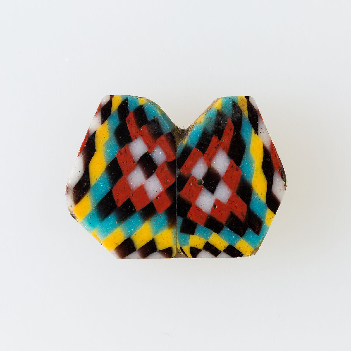 A mosaic glass technique allowed multiples of an image to be created: a figural or design composition was made by bundling colored glass canes, which were then drawn out into a long bar. The bar was then sectioned at right angles, probably by striking the bar with appropriate tools, to produce small inlay tiles. The tile would then be smoothed and polished on the face intended to appear outwards.
