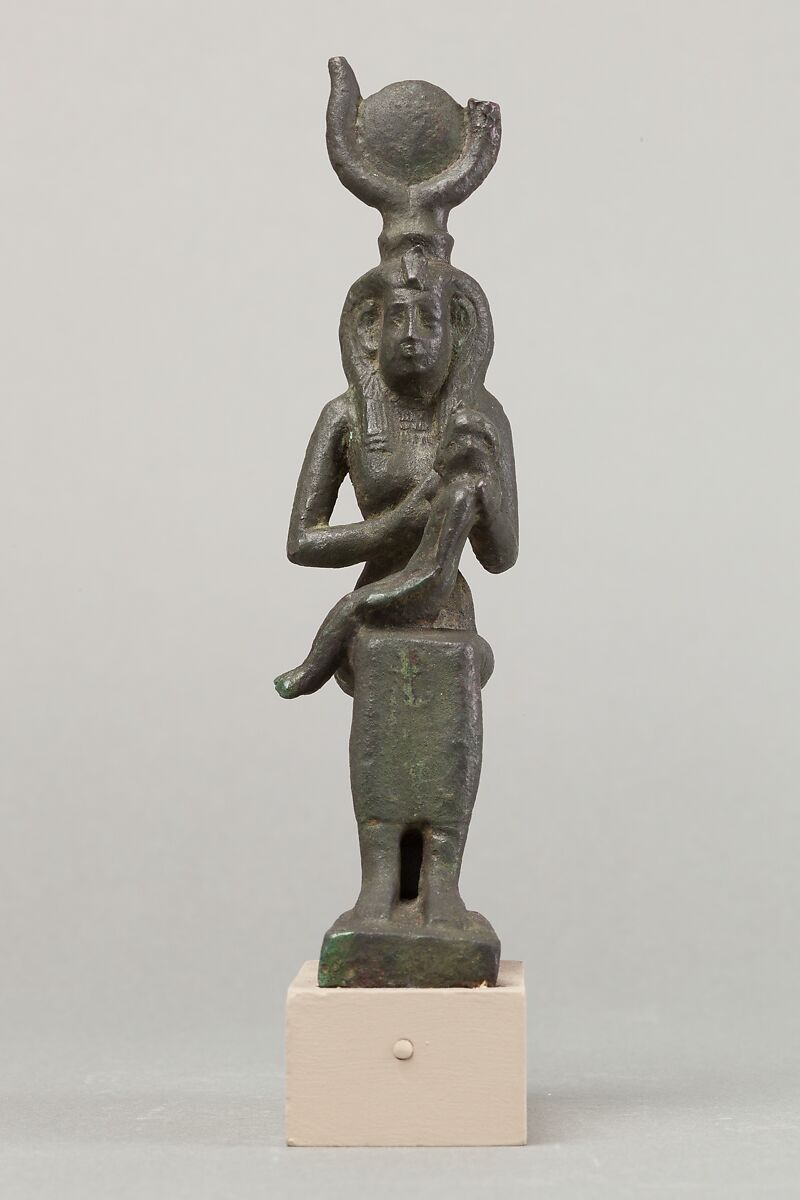 She is nearly always depicted in anthropomorphic form, standing or seated on a throne. This statuette shows the goddess in her most beloved pose, nursing her son Horus (known also as the lactans pose). Other goddesses sometimes nurse Horus or other child gods, but Isis is preeminent among them in this role. She wears the horned crown that by the Late Period she had adopted from the goddess Hathor, as well as the vulture headdress that emphasized the role of goddesses as royal mothers. On this figure, her jaw and neck are unusually rounded and the lips are very small and pursed.