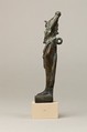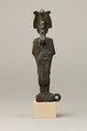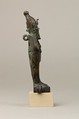 Osiris, foremost of the Egyptian funerary gods and ruler of the underworld, stands upright in a close-fitting mummiform garment. The garment hugs the contours of his arms and buttocks and has a stiff upper edge along the back of the neck, a feature that occurs with some regularity on this garment, but one with an unclear meaning. He holds the royal crook and flail with his hands posed asymmetrically.