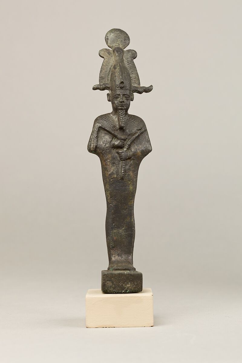 Osiris, foremost of the Egyptian funerary gods and ruler of the underworld, stands upright and wears an atef crown with a sun disk on top and ram horns below. His facial features are sensitively modeled with plastic brows and thick, heavy eyelids. His close-fitting mummiform garment has a shallow stiff upper edge along the back of the neck, a feature that occurs with some regularity on this garment, but one with an unclear meaning. His hands and wrists, complete with bracelets, extend out from curved slits in his garment. He holds the royal crook and flail with his hands poised asymmetrically.