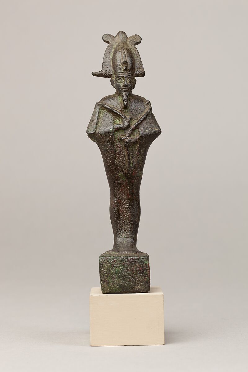 Osiris, foremost of the Egyptian funerary gods and ruler of the underworld, stands upright in a close-fitting mummiform garment. The garment has a prominent stiff upper edge along the back of the neck, a feature that occurs with some regularity on this garment, but one with an unclear meaning. Two streamers drape down the back of the garment. His hands emerge from long vertical slits in the cloak, which are visible on the chest. The god holds the royal crook and flail with his hands poised asymmetrically. The base is inscribed.