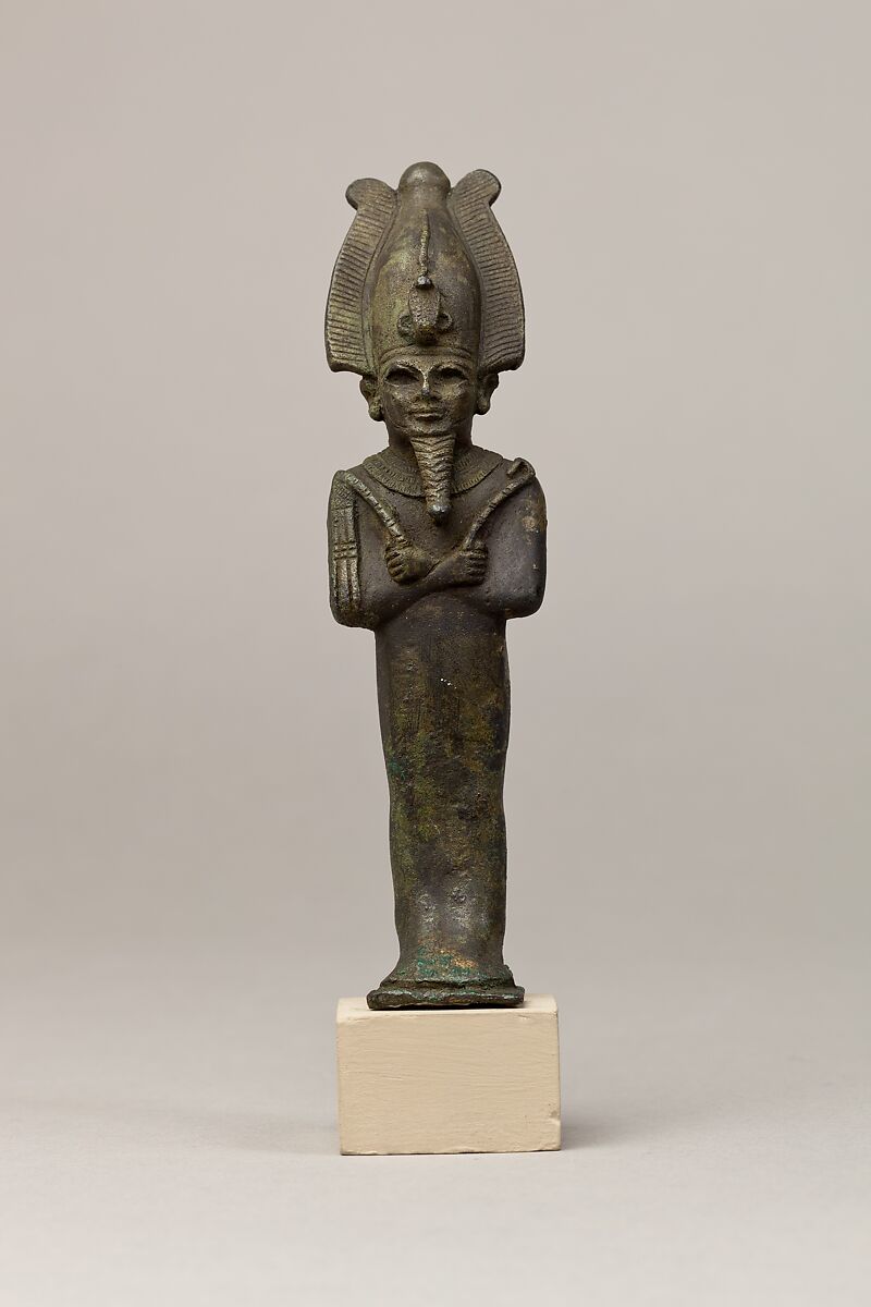 Osiris, foremost of the Egyptian funerary gods and ruler of the underworld, stands upright in a close-fitting mummiform garment. The garment hugs the contours of his arms and shoulders. He holds the royal crook and flail with his arms crossed on his chest. Copper alloy statuettes of Osiris generally exhibit one of three arm positions: asymmetrical with the right fist over the left, symmetrical with the fists touching, and arms crossed. The latter position, seen here, is the least common of the three but still frequently utilized. Why these arm positions are so consistently represented and how they relate to workshop practices, chronological changes, or conceptions of cult is unknown.