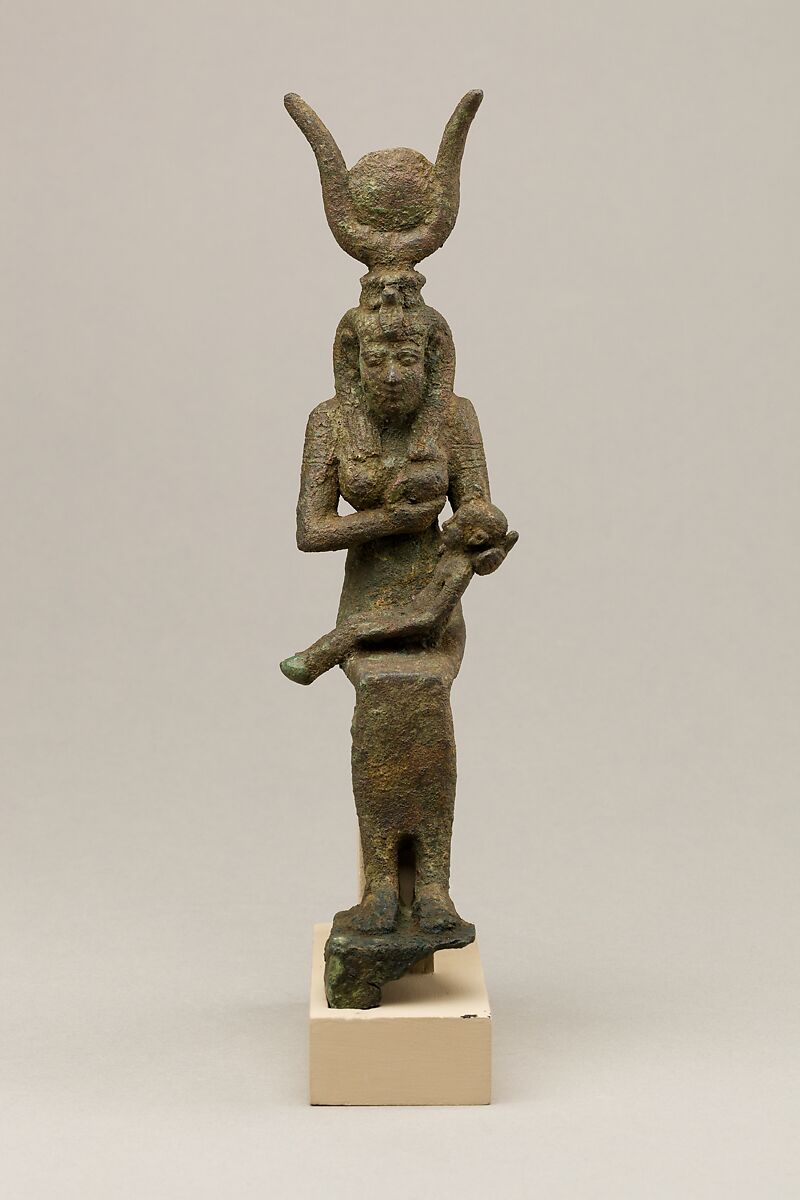 She is nearly always depicted in anthropomorphic form, standing or seated on a throne. This statuette shows the goddess in her most beloved pose, nursing her son Horus (known also as the lactans pose). Other goddesses sometimes nurse Horus or other child gods, but Isis is preeminent among them in this role. She wears the horned crown that by the Late Period she had adopted from the goddess Hathor, and armlets on her upper arms. Faint markings on Horus’s chest suggest that he wore an amulet, a common feature for child gods.