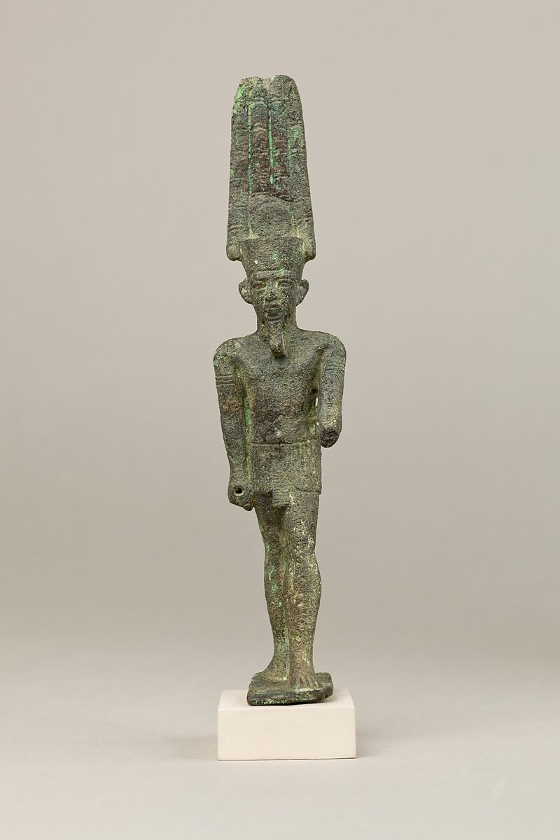 Amun was one of Egypt’s most celebrated deities, worshipped as a universal, cosmic god and frequently called the king of the gods. In copper alloy he is almost invariably shown, as here, in anthropomorphic form wearing a short kilt and a tall double feather crown with a sun disc, which alludes to his solar and cosmic aspects, including his conflation with the sun god Re. Further elaborations on this statuette include a broad collar and arm bands. His right hand is socketed for the attachment of an attribute.