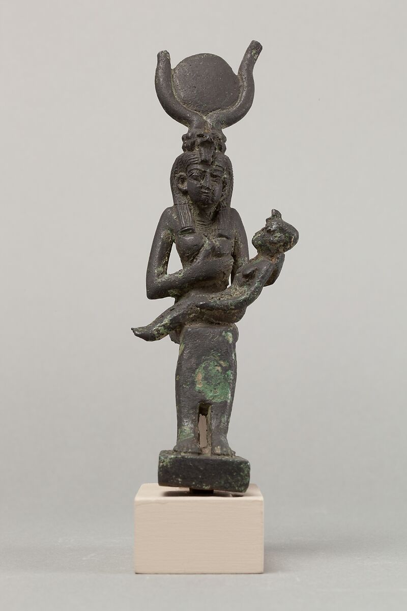 She is nearly always depicted in anthropomorphic form, standing or seated on a throne. This statuette shows the goddess in her most beloved pose, nursing her son Horus (known also as the lactans pose). Other goddesses sometimes nurse Horus or other child gods, but Isis is preeminent among them in this role. She wears the horned crown that by the Late Period she had adopted from the goddess Hathor, as well as the vulture headdress that emphasized the role of goddesses as royal mothers.