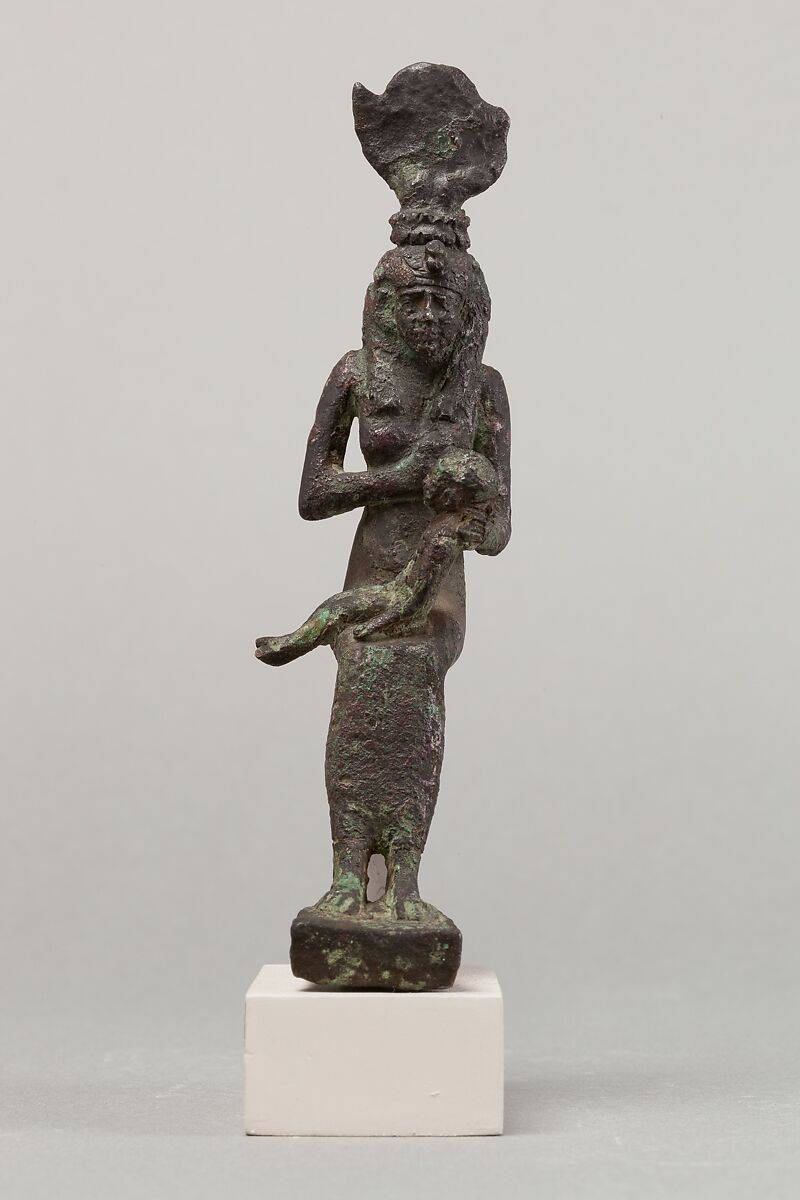 She is nearly always depicted in anthropomorphic form, standing or seated on a throne. This statuette shows the goddess in her most beloved pose, nursing her son Horus (known also as the lactans pose). Other goddesses sometimes nurse Horus or other child gods, but Isis is preeminent among them in this role. She wears the horned crown that by the Late Period she had adopted from the goddess Hathor.