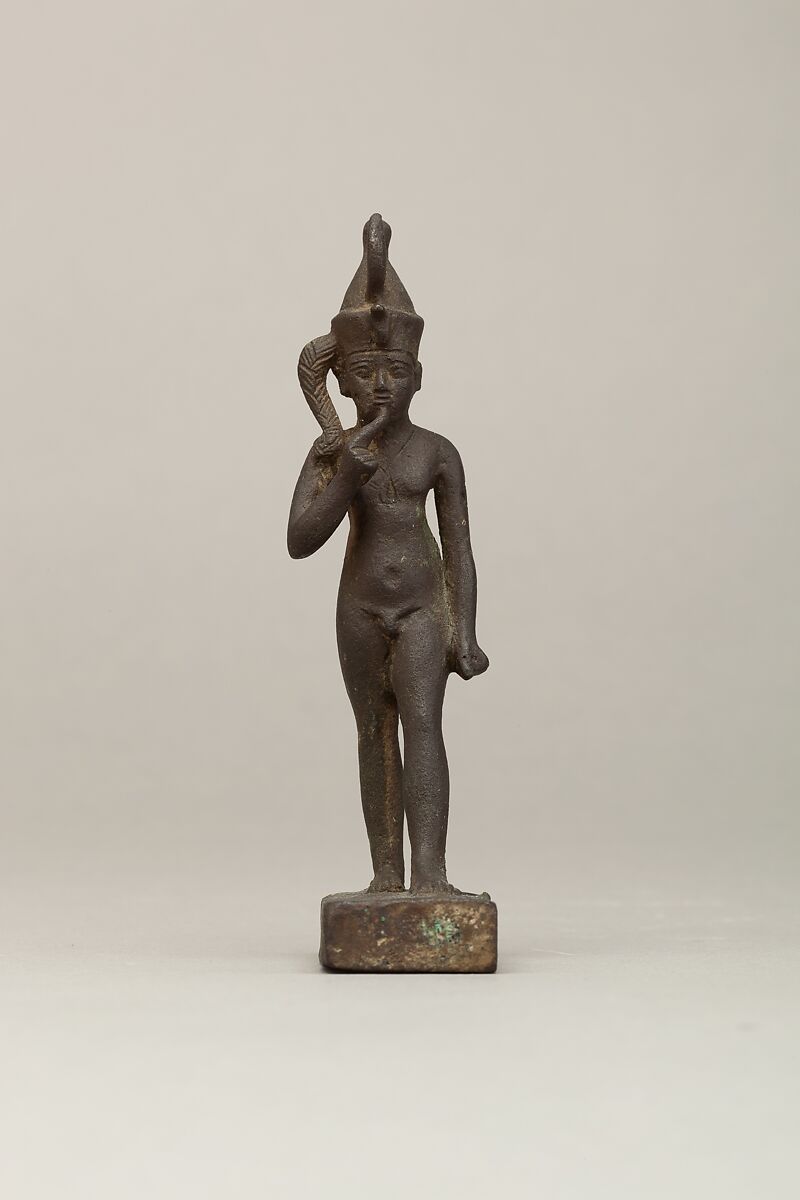 The figure represents a child god in a striding/standing position, wearing the double crown, which alludes to his royal status. The child god is distinguished from adult gods by a range of iconographic clues: his nudity, the finger raised to the mouth (a child-like gesture), and the sidelock on the right side of his head. He wears an amulet on his chest, another attribute common to child gods but not adult gods.