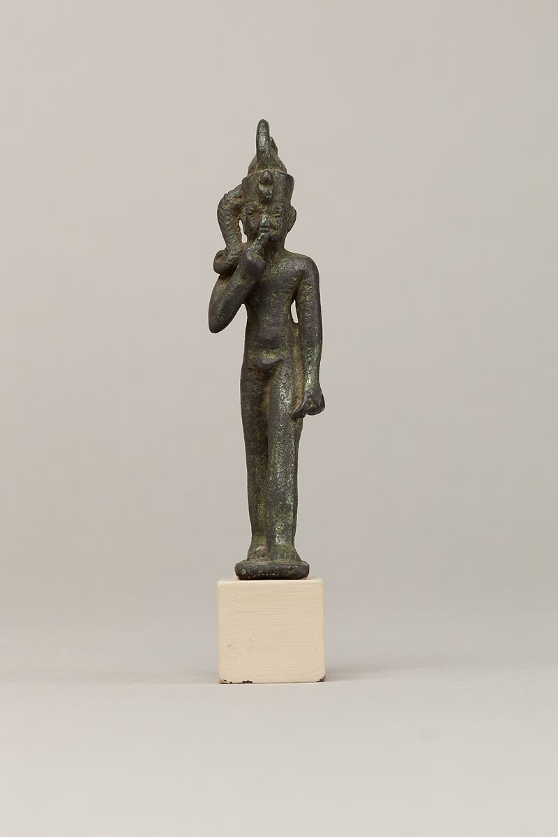 Child gods grew in popularity and cult from the Third Intermediate Period onwards, rivaling even the most powerful and ancient gods, especially as temple offerings. Without an inscription, it can be very difficult to securely distinguish and identify particular child gods, but here the double crown identifies the god as Harpokrates (Horus the Child), who was the son of Osiris and Isis. This royal crown symbolizes the union of Lower and Upper Egypt, and highlights Horus’ role as the legitimate ruler of the entire land and his direct association with the king.