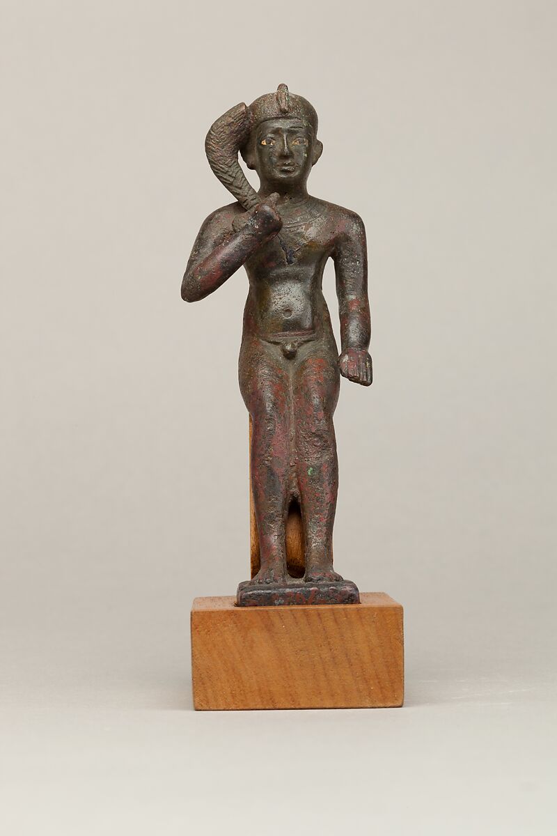 The figure represents a child god in a seated/reclining position, wearing a cap and uraeus. The child god is distinguished from adult gods by a range of iconographic clues: his nudity, the finger raised to the mouth (a child-like gesture), and the thick sidelock on the right side of his head. Small details show the fine workmanship of the piece and hint at its original, even greater, beauty: the cap crown is stippled, either for decoration or the addition of gilding; the eyes are gilded, which lends some contrast and color to the face; the broad collar is articulated on the front and back with a counterpoise; and an amulet hangs beneath the broad collar on the chest. The amulet is another attribute common to child gods but not adult gods. Meanwhile, his slightly plump, well-fed belly hints at his ability to bring about prosperity and abundance.