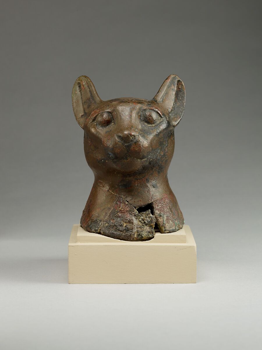 The cat was sacred to the goddess Bastet, and was offered in sanctuaries and deposited in animal necropoleis throughout Egypt. This cat has a sensitively modeled face, with sharp, clean lines and attentive, large inset eyes.