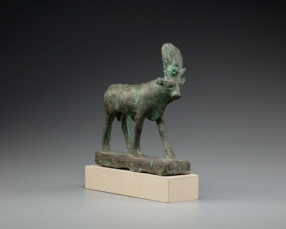 The worship of the Apis bull is attested as early as Dynasty I. Arguably the Apis, unlike many sacred animals in Egypt, was not just favored by a certain deity, but was considered a deity in his own right. A single living representative was stabled near the Ptah temple in Memphis. The bull selected for this important role had certain colorful markings, such as a white triangle on the forehead, and black patches resembling winged birds or scarabs on the body. The bull is often shown, as here, wearing a large sun disc, a banded collar, and a decorated rectangular cloth on its back. Similar markings are easily visible on Apis 17.190.62. An inscription on the base provides the name of the donor and his parents.