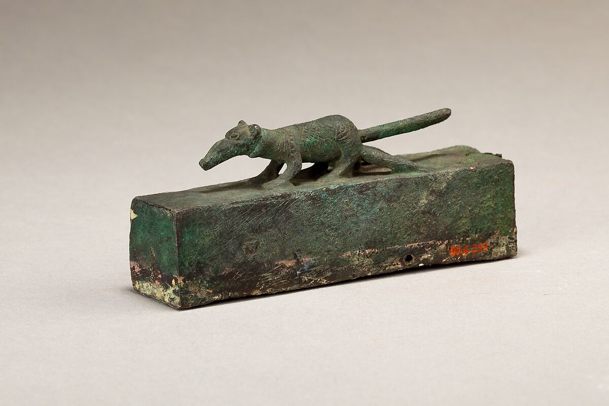 The shrew mouse was an animal sacred to the solar deity Horus of Letopolis, but was honored all over Egypt, particularly in the Delta. The mouse was considered to be the blind eye of Horus, which was miraculously healed, thereby symbolizing resurrection and rebirth. The shrew has a long narrow snout, rounded ears, and a thin body. It stands in a slightly crouched position on a long rectangular box. Struts extend from the back legs to the base, an unusual feature. In the lost wax casting process, which was used to make this piece, channels called gates and vents allow for the release of gases during casting and ease the flow of the bronze. These channels fill with bronze in the final step of casting and then are usually cut away by the artist afterward. It is likely that these struts are leftovers from the casting process.