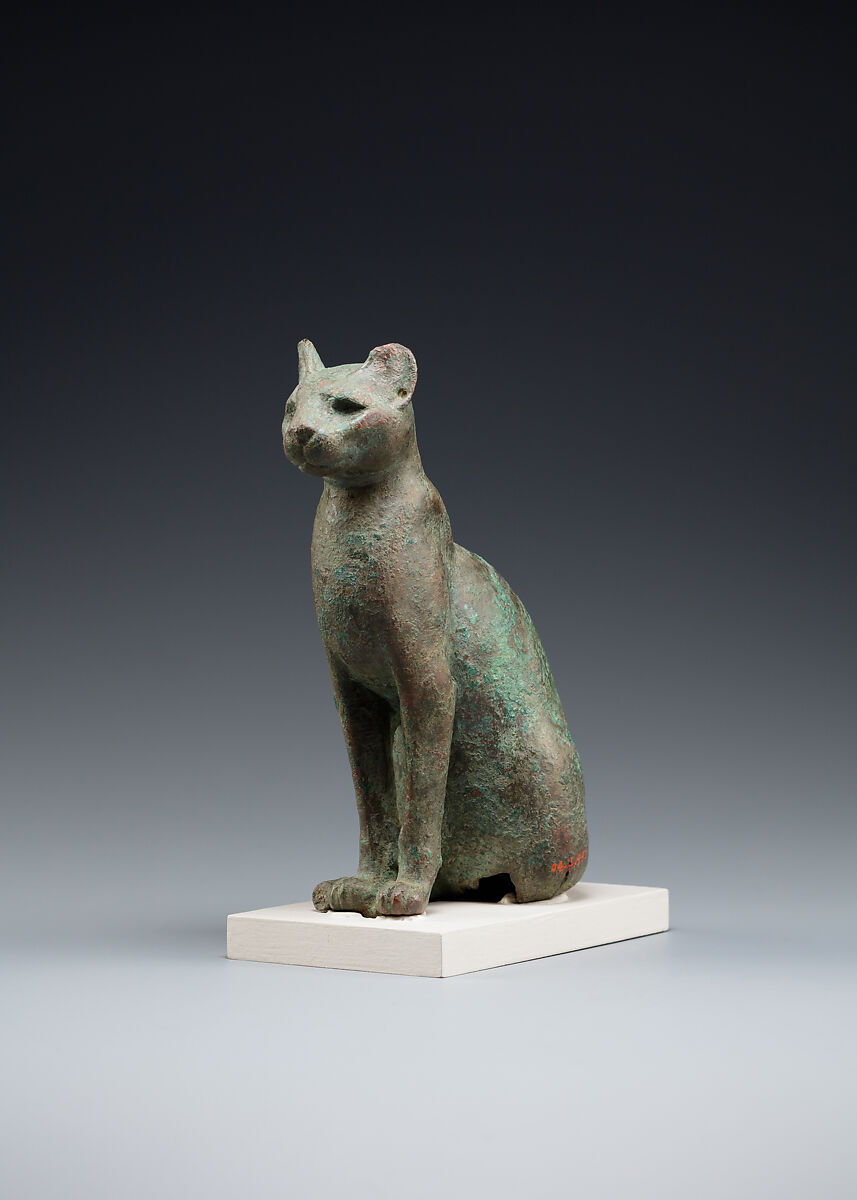 Cat statuettes were among some of the most common zoomorphic dedications of the Late and Ptolemaic Periods. Small statuettes would have been dedicated as offerings to temples or deposited in catacombs alongside cat mummies, as at the extensive catacombs at Bubastis and Saqqara. Sometimes larger hollow examples held a cat mummy inside.