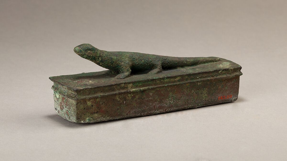 The lizard in later periods of Egyptian history was linked with the creator and solar god Atum, in large part because of their reptilian tendency to warm themselves in the sunshine. Almost all copper alloy representations show the lizards prone, with legs slightly splayed, as if basking in the sun’s rays. Most rest on top of boxes that would have held mummified lizards. Boxes like these generally open at the back end for the insertion of the mummy; on this shrine-shaped example, the bottom panel slides out, allowing for easier access. These boxes would have been offered in temples or for deposition in animal necropoleis, not just in honor of Atum, but also in broad connection with other animal representations linked to solar cult, such as shrew mice, ichneumons, or falcons.