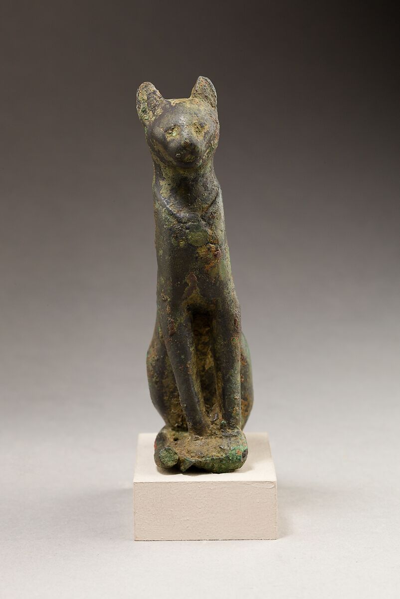 Like cat-headed Bastet statuettes, these seated cats often have special adornments, like earrings or broad collars. This figure wears an amulet on its chest, probably an aegis. Cat statuettes were among some of the most common zoomorphic dedications of the Late and Ptolemaic Periods. Small statuettes would have been dedicated as offerings to temples or deposited in catacombs alongside cat mummies, as at the extensive catacombs at Bubastis and Saqqara. Sometimes larger hollow examples held a cat mummy inside.