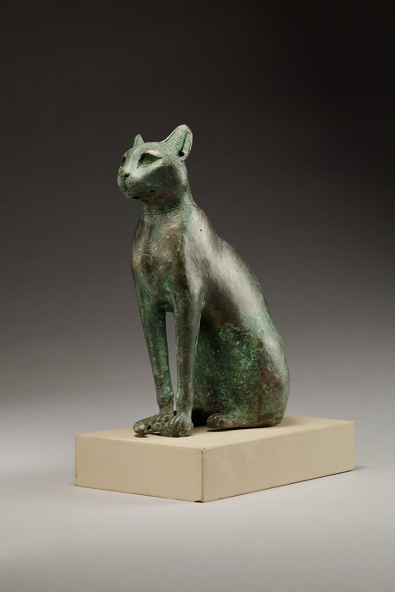 Cat statuettes like this one were among some of the most common zoomorphic dedications of the Late and Ptolemaic Periods. Small statuettes would have been dedicated as offerings to temples or deposited in catacombs alongside cat mummies, as at the extensive catacombs at Bubastis and Saqqara. Sometimes larger hollow examples held a cat mummy inside.