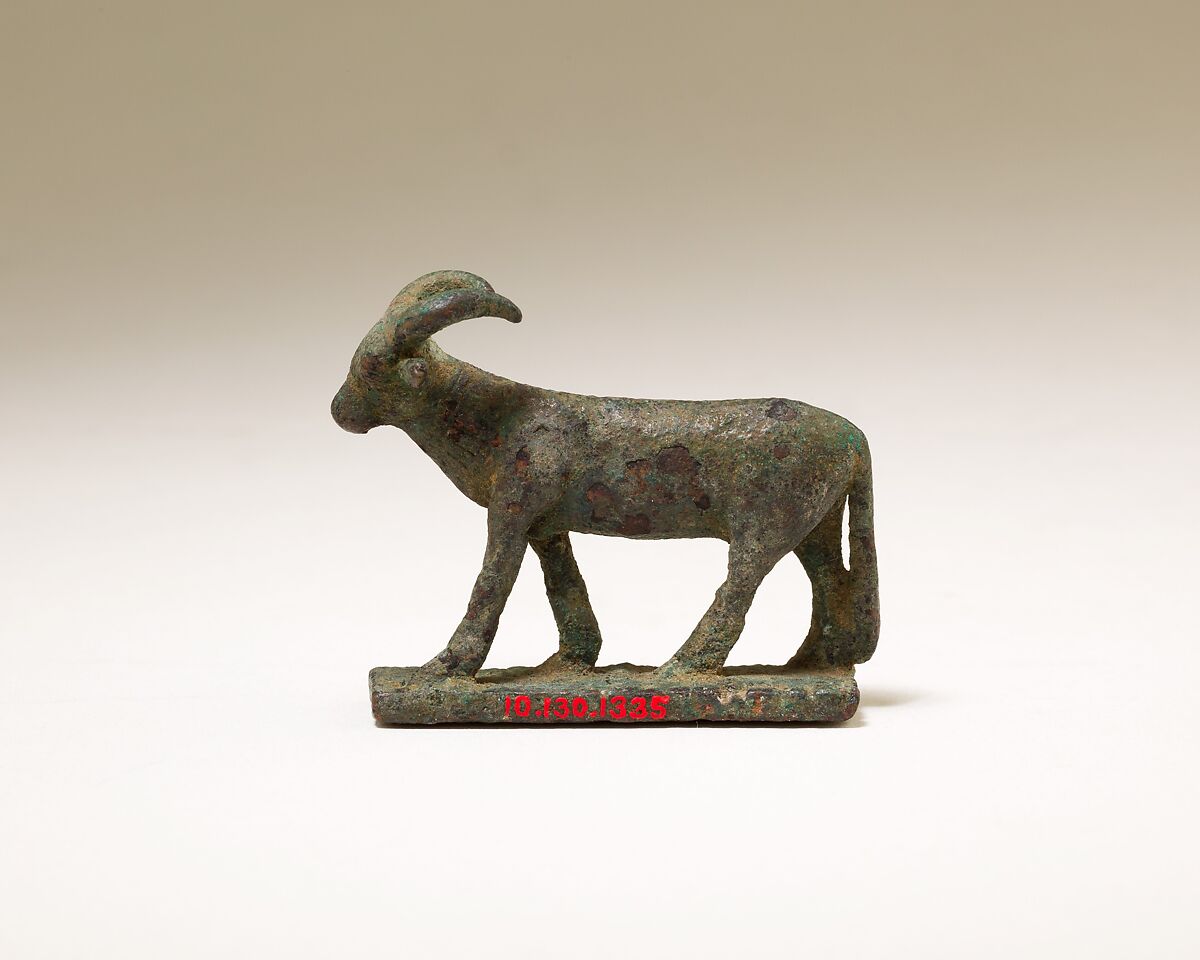 A horned quadruped strides forward and is positioned on a thin rectangular plinth. The overall appearance of the body is reminiscent of contemporary Apis bull representations, but in contrast, this animal has long horns that sweep backwards with no crown in between. The quadruped wears a collar, which is marked by evenly-spaced incised lines around the neck. It could represent an antelope, a desert animal associated with forces of chaos. In some bronze representations, the antelope is identified with Seth and used as a foil to Horus, who is shown spearing the antelope (for example, 45.2.11).