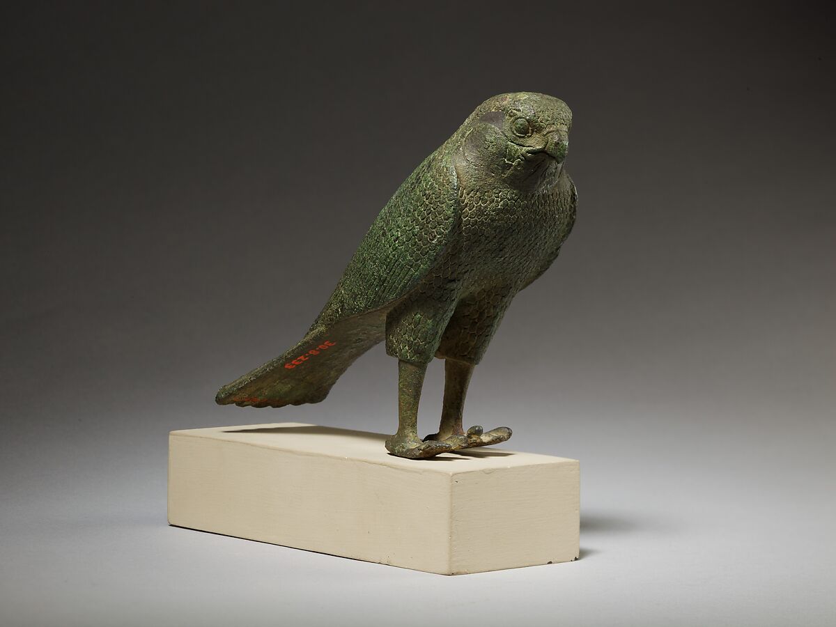 The falcon stands with his wings swept back. The figure has beautifully rendered facial markings and short and long feathers all over the body. The tail extends back behind the bird in a single long, clean line. The falcon could be a standalone offering but it is very likely that it once stood on a mummy box, which would have housed a falcon mummy. Such falcon mummy boxes, or sarcophagi, would have been offered for deposition in animal necropoleis, not just in relation to the cult of the famous falcon god Horus, but also more broadly in association with solar cult.