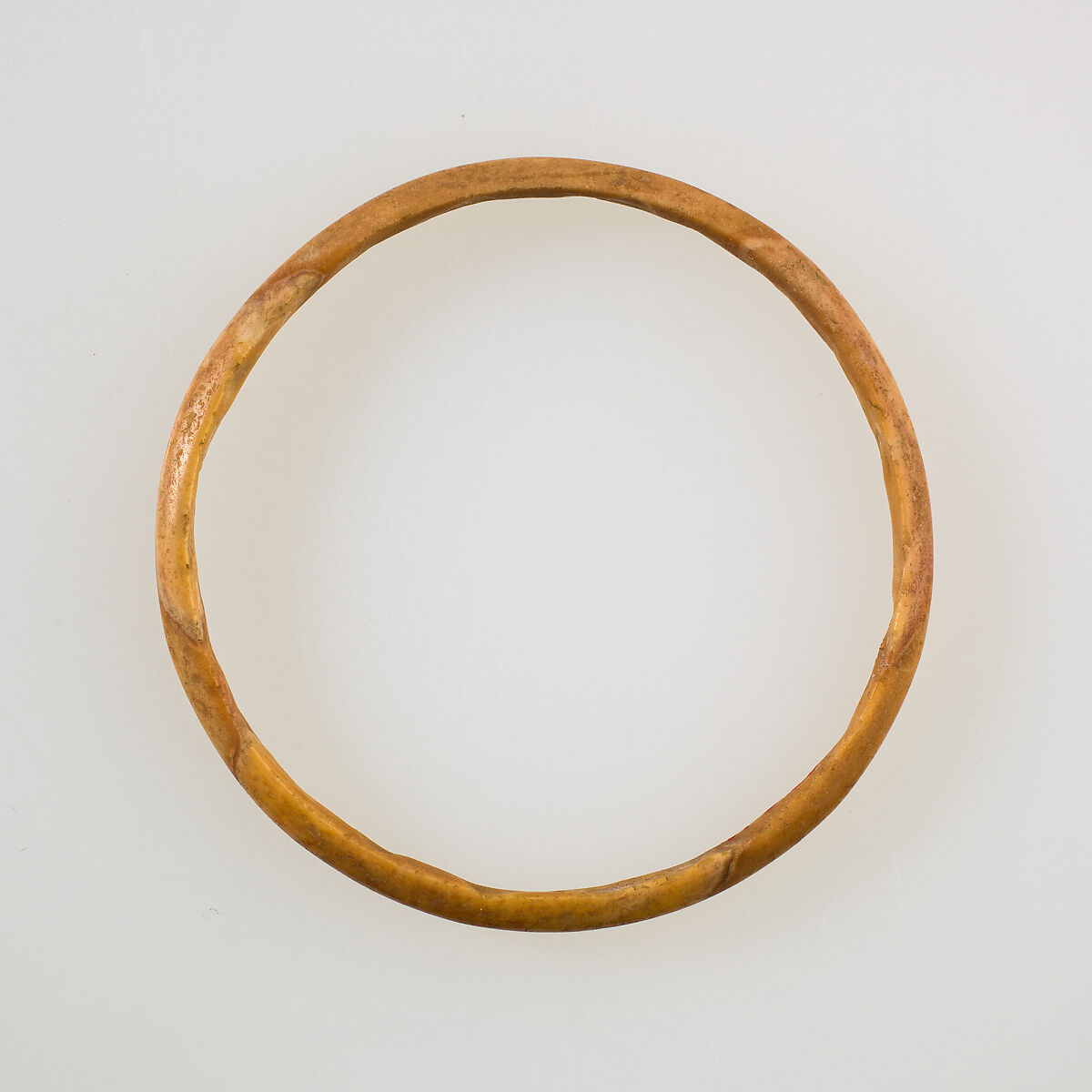 Flint bangles such as this one are mainly found in burials. The deceased often wore multiple bangles together, on one or both forearms. These items were in use for a relatively short time, only during the Early Dynastic period, and most examples date specifically to the First Dynasty. They were made through a combination of flaking and grinding. Flint bangles were extremely difficult to produce and demonstrate the exceptionally high degree of expertise achieved by Egypt’s flint knappers. They also show that Ancient Egyptians used flint for personal adornment and display, not just to make implements needed for utilitarian and subsistence purposes.