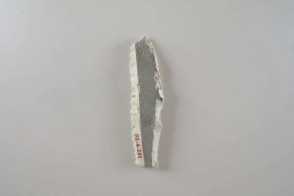 This small piece of flint was a key element to a successful agricultural season in ancient Egypt. Grain was a staple of the economy, as bread and beer made from grain were consumed daily. They also formed the foundation of eternal sustenance, as funerary offerings. Ancient Egyptians used sickles made from flint and wood to reap grain. Pieces of flint such as this one were shaped to fit into a wooden haft along with a number of other such inserts, and secured with an adhesive. The flint pieces provided a sharp edge to cut the grain stalks. With use, the flint would wear down and develop a shiny gloss. The flint inserts could be re-sharpened or replaced as needed. Flint, rather than copper alloy, was the primary material used to make sickles in Egypt until the first millennium B.C. when iron became more widely available. The reason for using flint was probably multifaceted and included considerations such as its abundance, its ease of manufacture compared to casting metal tools, flint’s proficiency at cutting grain, and the relationships between the people who made flint tools and the people who used them.
