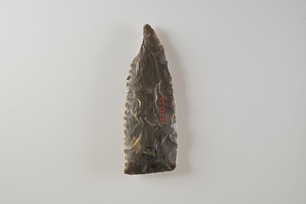 Bifacial sickle inserts like this constitute some of the earliest evidence for farming in Egypt. They were made mainly during the 5th- 4th millennia BC, after which they were replaced by sickle inserts made on thin blades with less invasive retouch. The sickle inserts on blades were faster to produce, but likely did not last as long as the larger, thicker bifacial inserts. This change marks a transition in systems of production and distribution of flint tools that coincided with the development of the state.