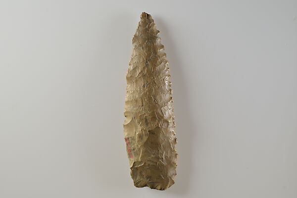 Bifacial sickle inserts like this constitute some of the earliest evidence for farming in Egypt. They were made mainly during the 5th- 4th millennia BC, after which they were replaced by sickle inserts made on thin blades with less invasive retouch. The sickle inserts on blades were faster to produce, but likely did not last as long as the larger, thicker bifacial inserts. This change marks a transition in systems of production and distribution of flint tools that coincided with the development of the state.