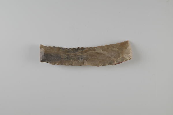 This small piece of flint was a key element to a successful agricultural season in ancient Egypt. Grain was a staple of the economy, as bread and beer made from grain were consumed daily. They also formed the foundation of eternal sustenance, as funerary offerings. Ancient Egyptians used sickles made from flint and wood to reap grain. Pieces of flint such as this one were shaped to fit into a wooden haft along with a number of other such inserts, and secured with an adhesive. The flint pieces provided a sharp edge to cut the grain stalks. With use, the flint would wear down and develop a shiny gloss. The flint inserts could be re-sharpened or replaced as needed.