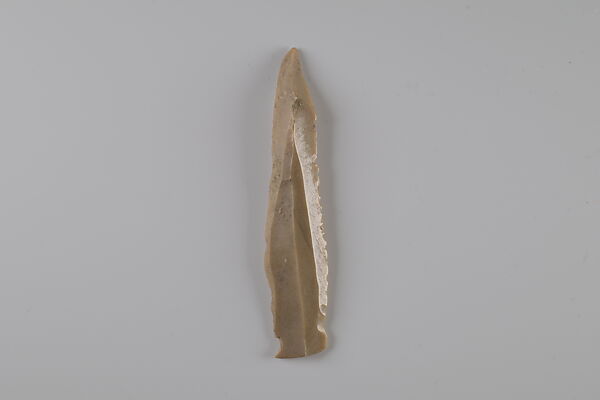 This small piece of flint was a key element to a successful agricultural season in ancient Egypt. Grain was a staple of the economy, as bread and beer made from grain were consumed daily. They also formed the foundation of eternal sustenance, as funerary offerings. Ancient Egyptians used sickles made from flint and wood to reap grain. Pieces of flint such as this one were shaped to fit into a wooden haft along with a number of other such inserts, and secured with an adhesive. The flint pieces provided a sharp edge to cut the grain stalks. With use, the flint would wear down and develop a shiny gloss. The flint inserts could be re-sharpened or replaced as needed. Flint, rather than copper alloy, was the primary material used to make sickles in Egypt until the first millennium B.C. when iron became more widely available. The reason for using flint was probably multifaceted and included considerations such as its abundance, its ease of manufacture compared to casting metal tools, flint’s proficiency at cutting grain, and the relationships between the people who made flint tools and the people who used them.