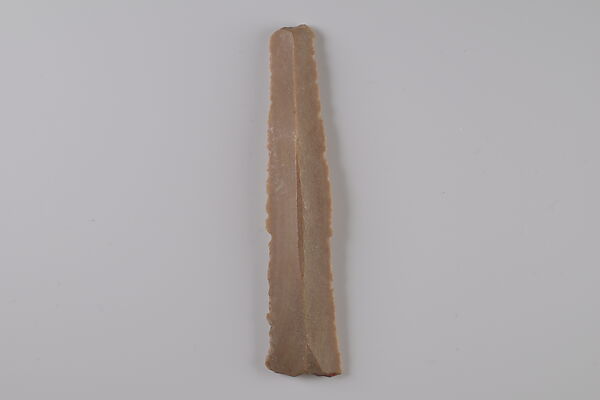 This small piece of flint was a key element to a successful agricultural season in ancient Egypt. Grain was a staple of the economy, as bread and beer made from grain were consumed daily. They also formed the foundation of eternal sustenance, as funerary offerings. Ancient Egyptians used sickles made from flint and wood to reap grain. Pieces of flint such as this one were shaped to fit into a wooden haft along with a number of other such inserts, and secured with an adhesive. The flint pieces provided a sharp edge to cut the grain stalks. With use, the flint would wear down and develop a shiny gloss. The flint inserts could be re-sharpened or replaced as needed. Flint, rather than copper alloy, was the primary material used to make sickles in Egypt until the first millennium B.C. when iron became more widely available. The reason for using flint was probably multifaceted and included considerations such as its abundance, its ease of manufacture compared to casting metal tools, flint’s proficiency at cutting grain, and the relationships between the people who made flint tools and the people who used them.
