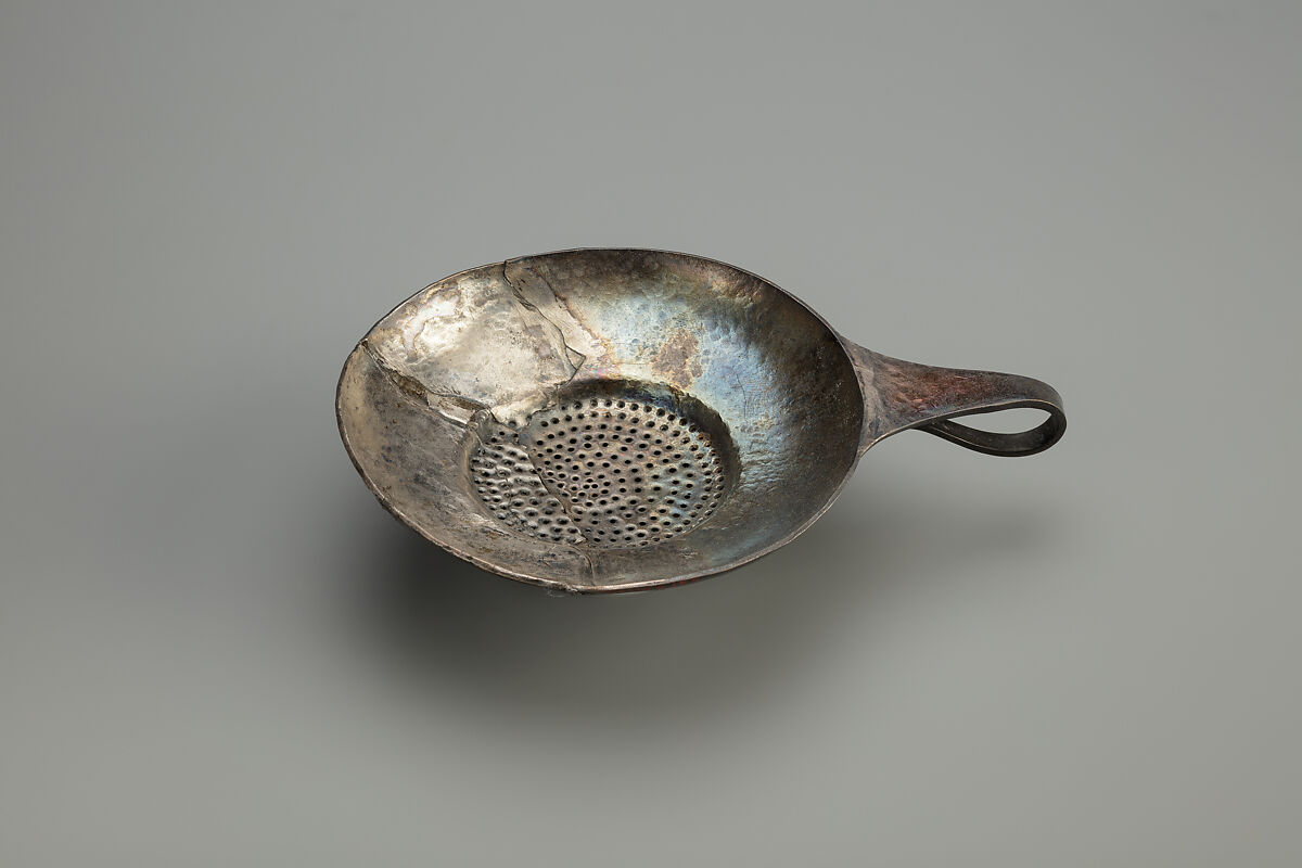 This fragment of a shallow strainer (see 30.8.369 for a complete example) once formed part of a drinking service. It would have been used to filter sediment from wine as it was poured from jugs, jars or flasks into bowls, goblets or situlas.