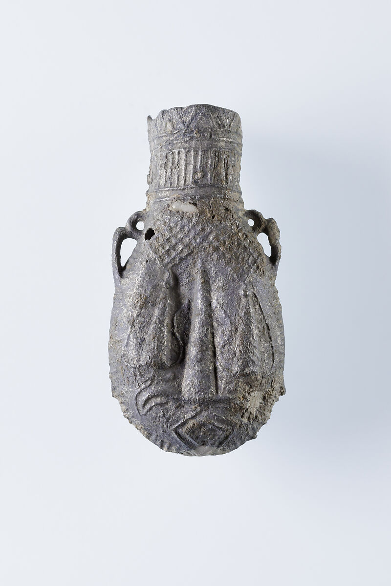 This small vial takes the shape of an ovoid amphora with a tall neck and thin handles. The relief decoration includes geometric forms, such as the zig-zags and vertical lines around the neck and the gridded hanging triangles on the shoulders; the body is adorned with vertical forms that may represent trees. Clearly post-Ramesside, this vessel finds parallels both in the Byzantine world and with later Islamic vessels from the 13th and 14th Centuries A.D.