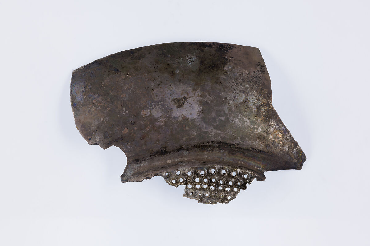 This profile fragment includes the rim and base from a shallow strainer (see 30.8.369 for a complete example). Wine would have been poured into drinking vessels from jugs or flasks through such strainers in order to filter out any sediment.