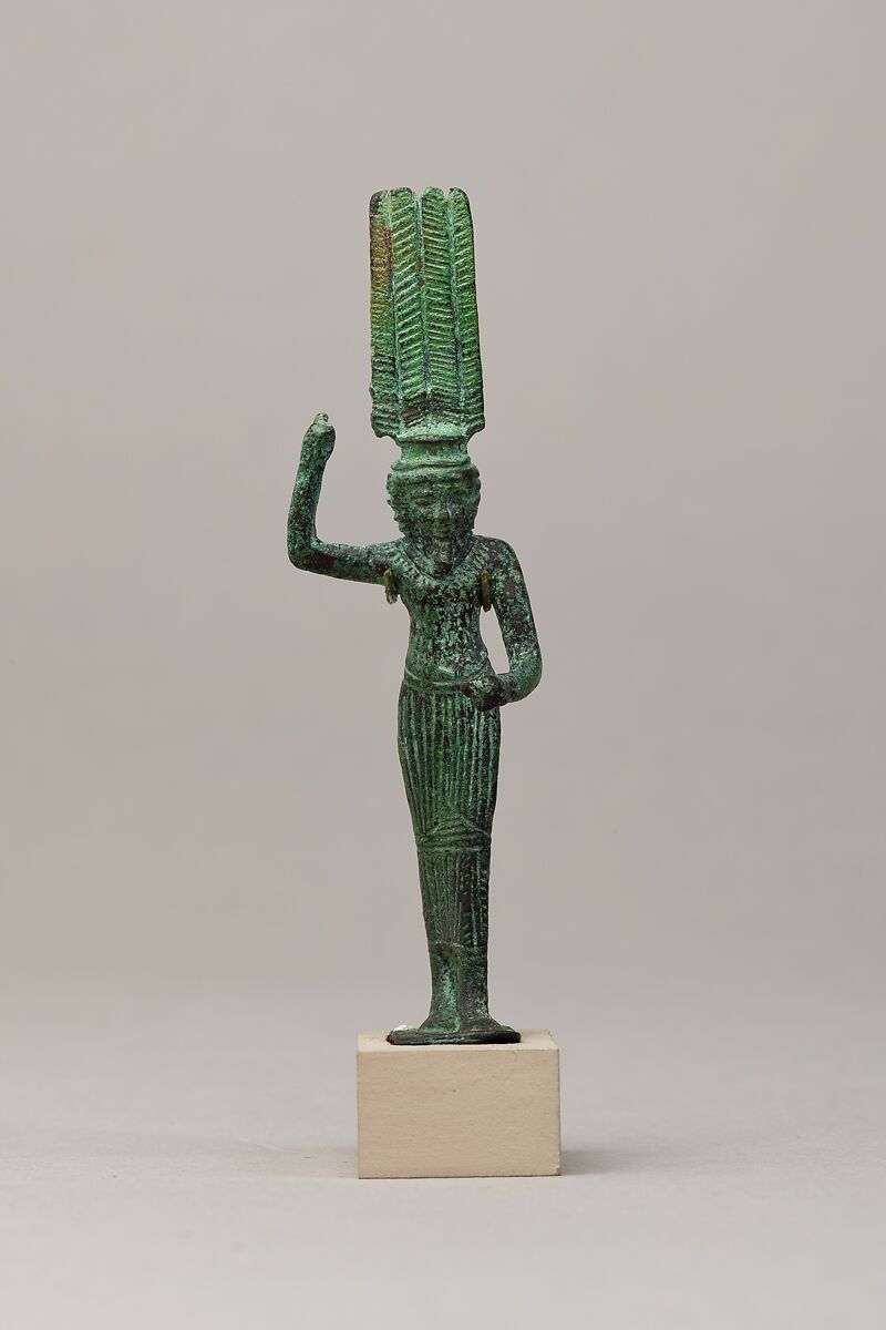Onuris is depicted here, recognizable by his short hair and distinctive garment, which comprises a short kilt over a long patterned one, in this case combined with a detailed feathered or scaled cuirass. A double feather crown, rather than the frequent four feather crown, rests on his short hair, which is here oddly rendered with thick horizontal ridges . Onuris was a fierce god, known for capturing enemies in battle or hunting dangerous animals. His right arm is raised in the act of spearing a defeated enemy or animal, or holding a rope, which presumably he used to snare his prey. In this role, he personified good conquering and controlling forces of chaos and disruption.