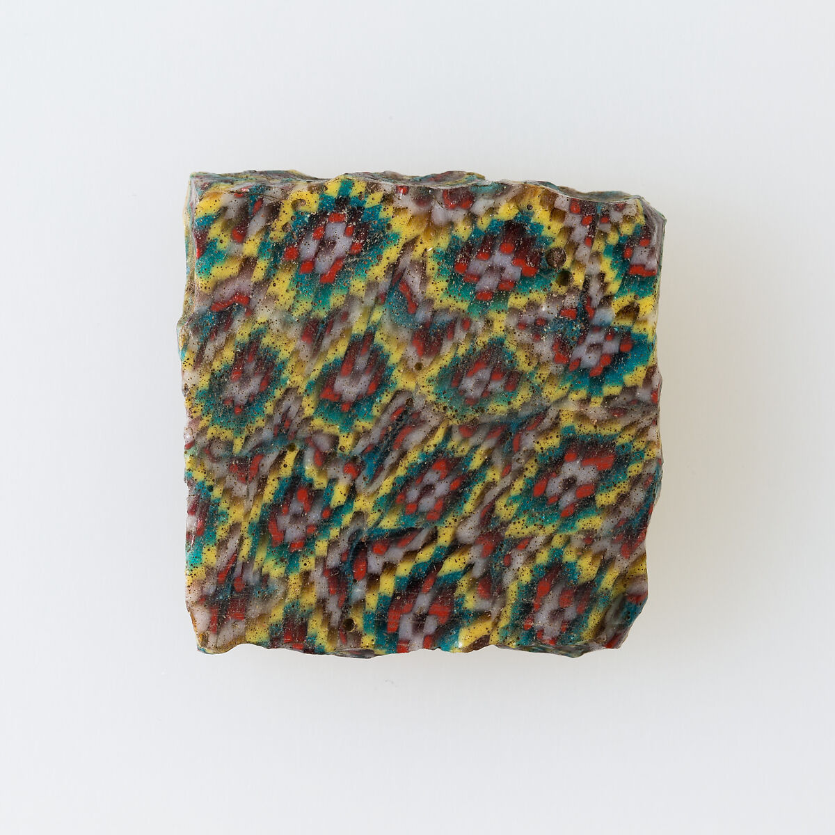 A mosaic glass technique allowed multiples of an image to be created: a figural or design composition was made by bundling colored glass canes, which were then drawn out into a long bar. The bar was then sectioned at right angles, probably by striking the bar with appropriate tools, to produce small inlay tiles. The tile would then be smoothed and polished on the face intended to appear outwards.