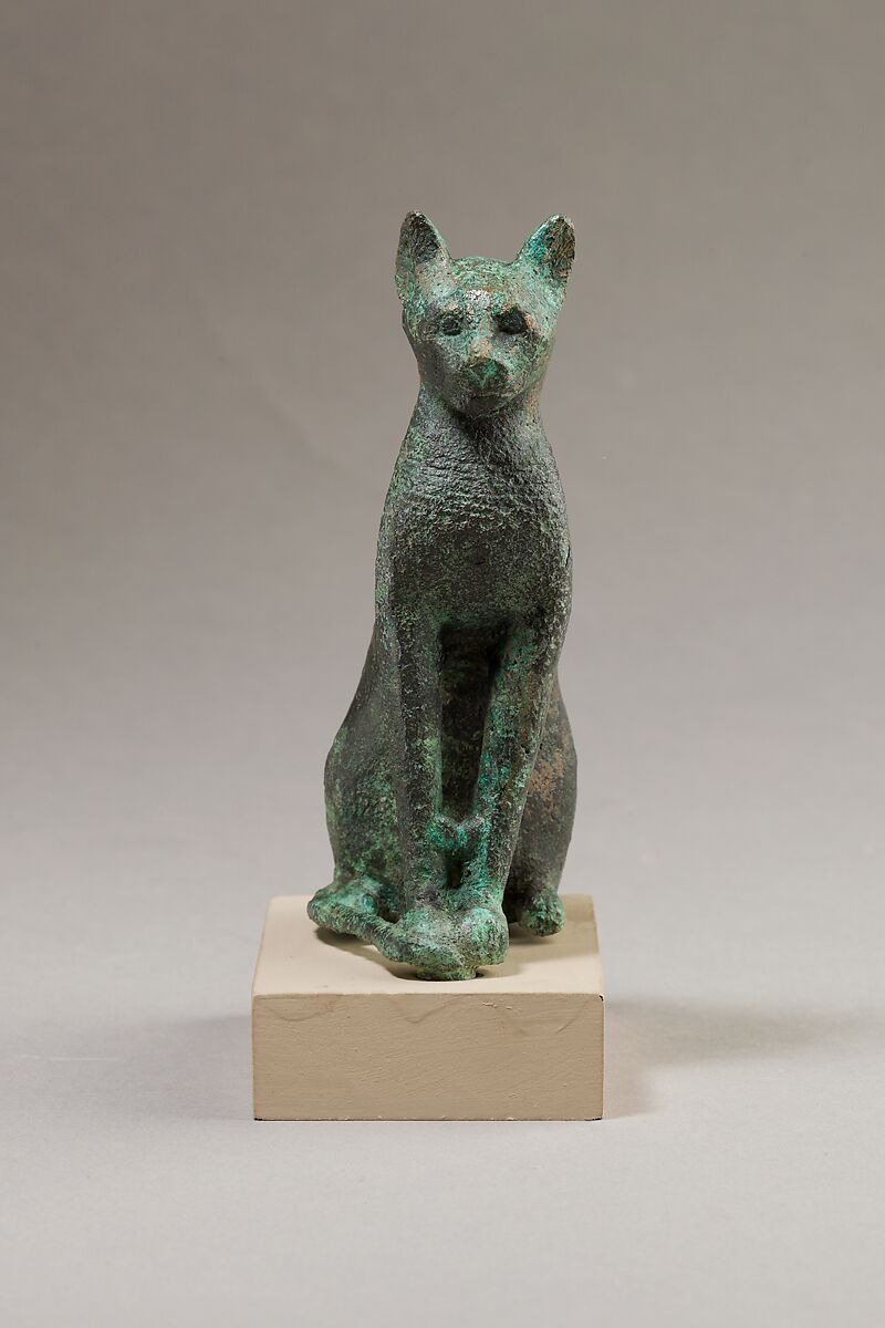 Cat statuettes were among some of the most common zoomorphic dedications of the Late and Ptolemaic Periods. Small statuettes like this one would have been dedicated as offerings to temples or deposited in catacombs alongside cat mummies, as at the extensive catacombs at Bubastis and Saqqara. Sometimes larger hollow examples held a cat mummy inside.