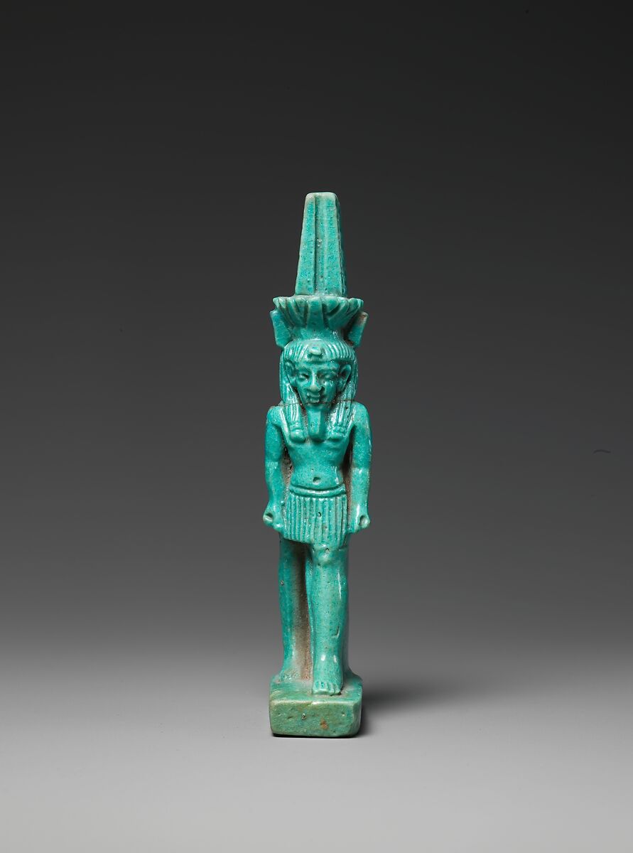 Nefertem, child of Ptah and Sakhmet, represented youthful power, and was identified with the lotus flower, a symbol of the newborn sun and regeneration. The god wears a lotus headdress with two tall feathers.