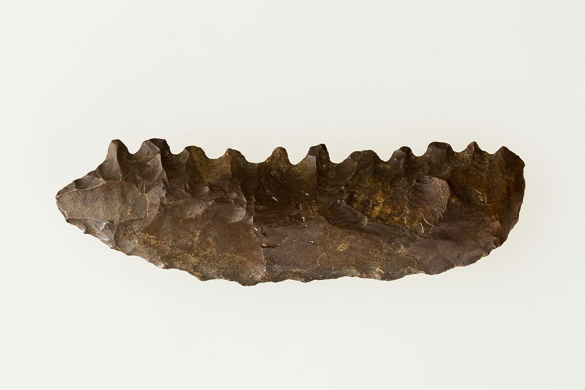 Bifacial sickle inserts like this constitute some of the earliest evidence for farming in Egypt. They were made mainly during the 5th- 4th millennia BC, after which they were replaced by sickle inserts made on thin blades with less invasive retouch. The sickle inserts on blades were faster to produce, but likely did not last as long as the larger, thicker bifacial inserts. This change marks a transition in systems of production and distribution of flint tools that coincided with the development of the state.