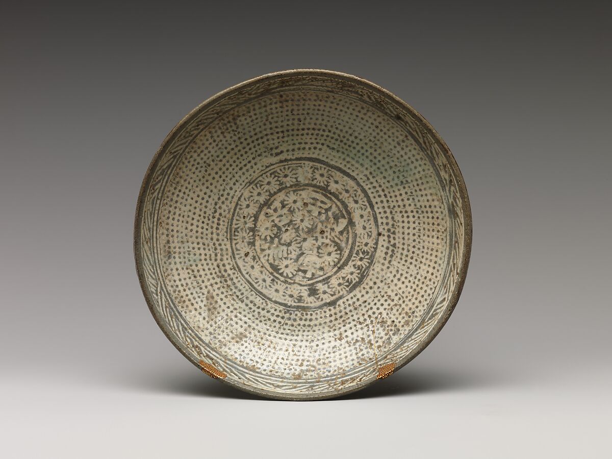 This dish decorated with chrysanthemums, dots, and lines is an example of buncheong ware, a Korean ceramic produced from the late fourteenth through the mid-sixteenth century. Easily overlooked amid the dense motifs, the inscription in the center roundel, 慶州長興庫 (경주장흥고), enlarged on the glass, identifies Gyeongju as the city where the dish was made and Jangheunggo as the government bureau that commissioned it.