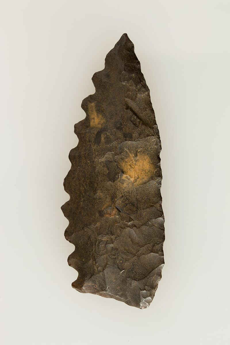 This small piece of flint was a key element to a successful agricultural season in ancient Egypt. Grain was a staple of the economy, as bread and beer made from grain were consumed daily. They also formed the foundation of eternal sustenance, as funerary offerings. Ancient Egyptians used sickles made from flint and wood to reap grain. Pieces of flint such as this one were shaped to fit into a wooden haft along with a number of other such inserts, and secured with an adhesive. The flint pieces provided a sharp edge to cut the grain stalks. With use, the flint would wear down and develop a shiny gloss. The flint inserts could be re-sharpened or replaced as needed.