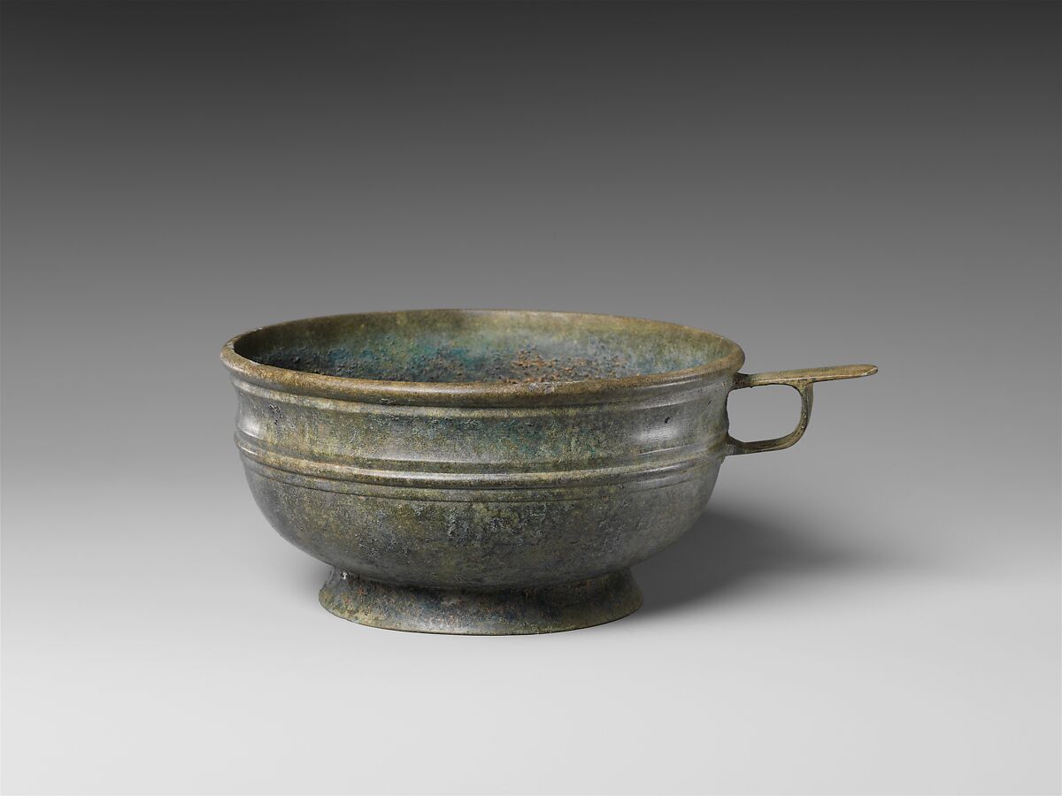 Subtle details contribute to the elegant form of this bronze bowl. The slightly flared, rolled mouth and ridge along the body align with the delicate handle; they may have both decorative and structural purpose. The handle’s flat top and rectangular shape offer a contrast with the spherical bowl.