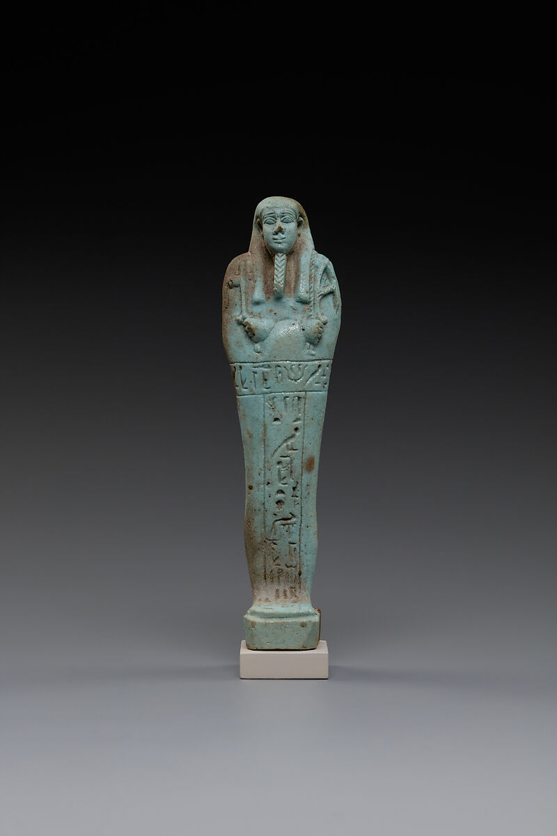 This shabti comes from a tomb discovered in 1902 at the site of the ancient city of Mendes (Tell el-Rub’a), the capital of Egypt for a short time during the Late Period. One of the two chambers of the tomb was almost completely empty, with only a few fragments of gold leaf left behind. In the second chamber were over 360 complete shabtis, plus a number of fragments. Most were inscribed, like this one, for the priest Nesbanebdjedet. Of these shabtis, 322 had the type of T-shaped inscription seen here (see also 10.130.1044a). About 100 of Nesbanebdjedet’s shabtis remained in Egypt; many more can be found in museum and private collections around the world.